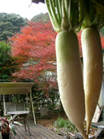 庭先に吊るした大根。まだまだお日様と寒風にさらされて、しんなりするまで干しておきます。干した大根のぬか漬けは普段の大根より甘みが増して、また違ったおいしさが味わえます。