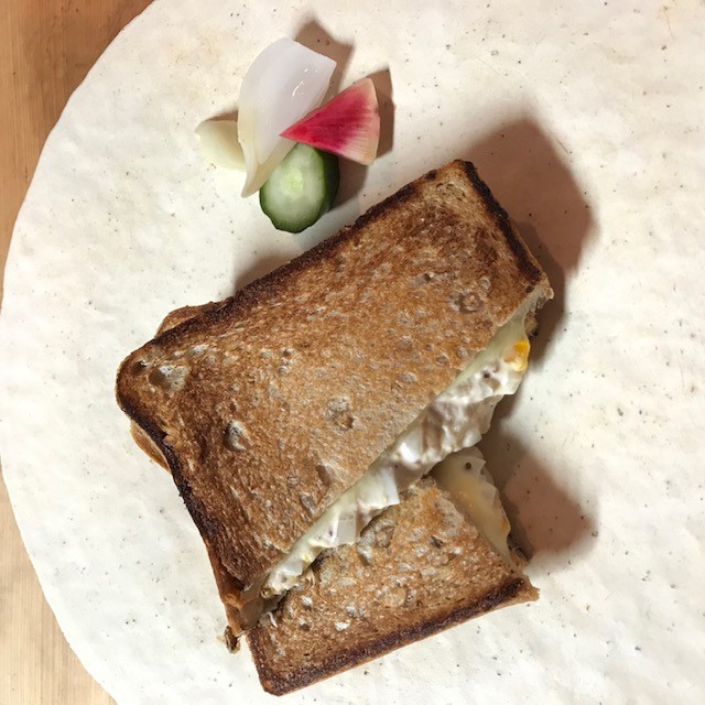 新たまねぎや葉付きのにんじん、アスパラガスにきゅうりなど。いよいよ漬け野菜も増えてきて、ぬか漬けシーズンの到来です。しっかり漬かった野菜にツナやチーズを加えてホットサンドを作った。新茶を味わい新緑を眺めながら、ピクニック気分で食べる「ぬか漬けサンド」もおすすめです。